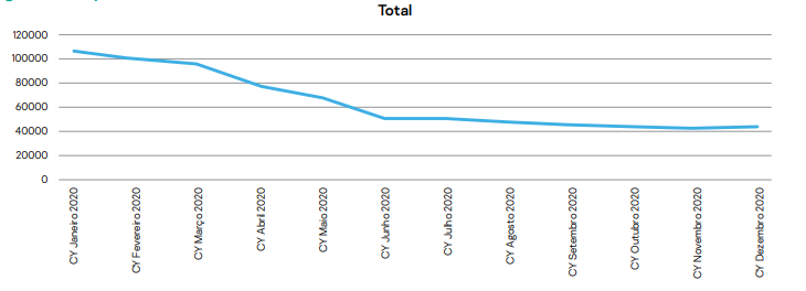 En comparación con 2019, Brasil tuvo una caída del 17% en la cantidad de ataques de stalkerware. Según los expertos de Kaspersky, la disminución de casos fue una tendencia mundial y está vinculada al período de aislamiento debido a la pandemia (con más personas en casa, había menos necesidad de vigilancia por parte de los perpetradores). Sin embargo, a partir de los meses en que se aflojaron las medidas restrictivas en varios países, los casos retomaron el ritmo anterior.